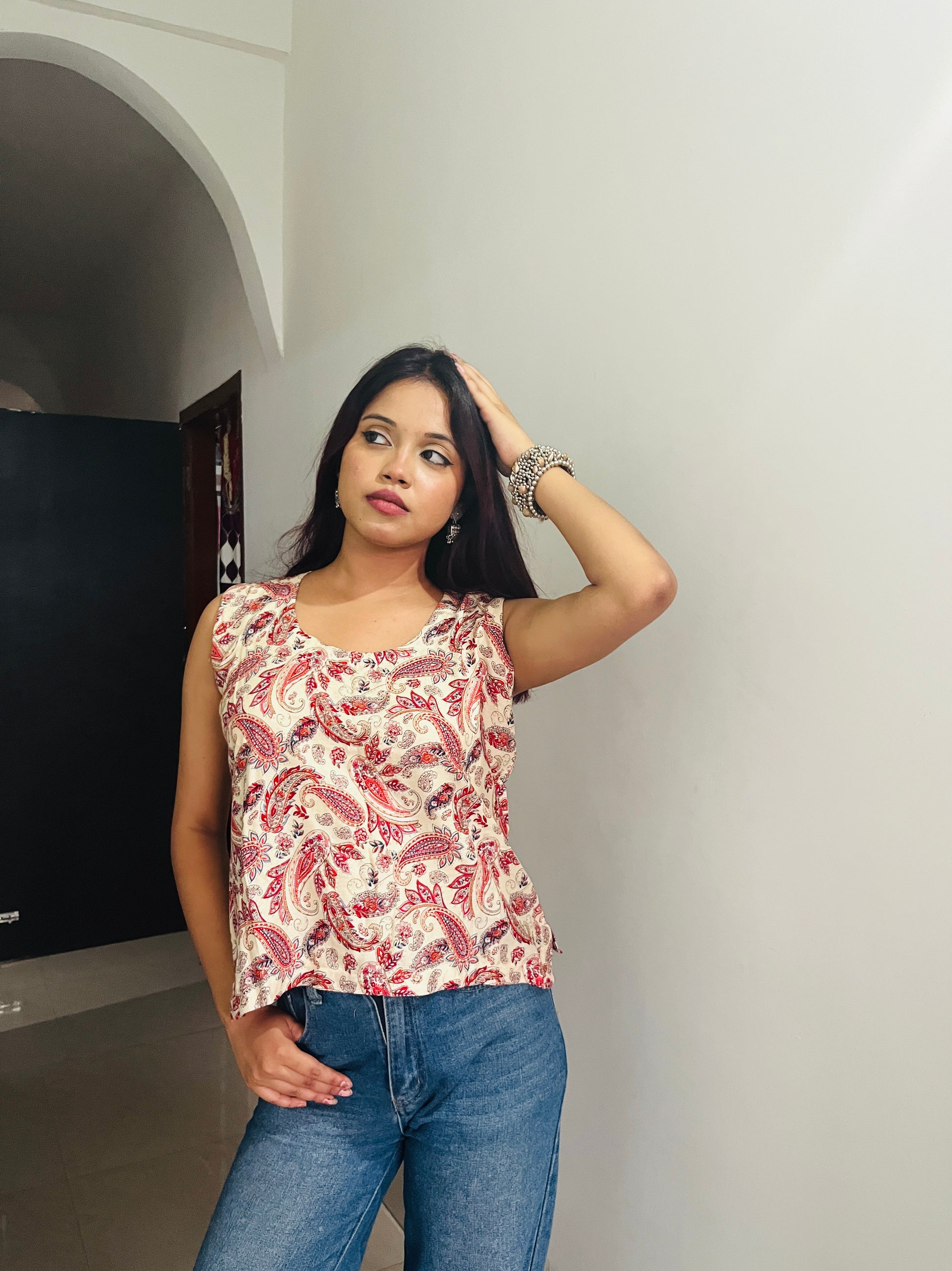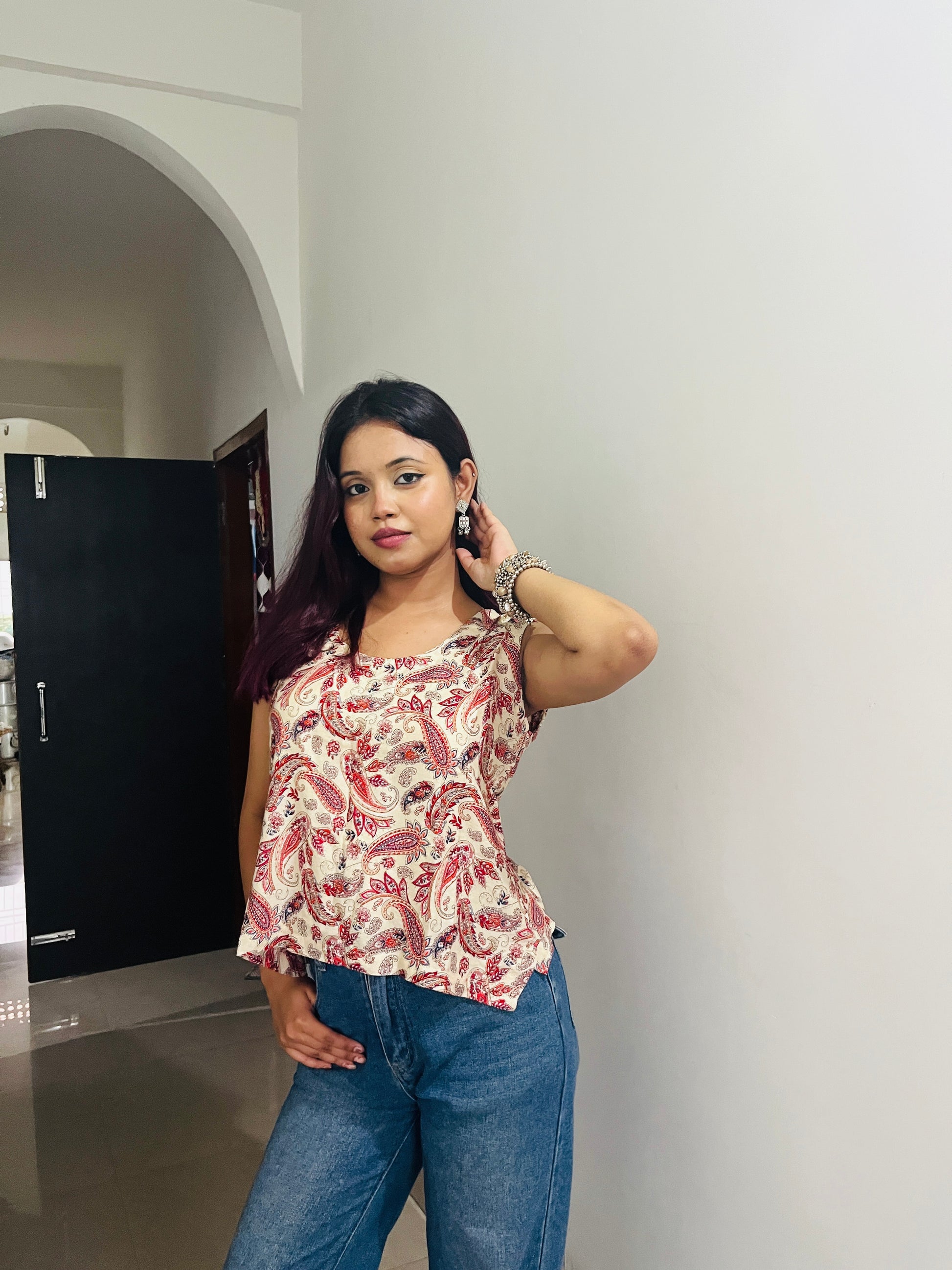 Flowy cotton top layered with effortless paisley print. Comfortable ,relaxed ,and chic.