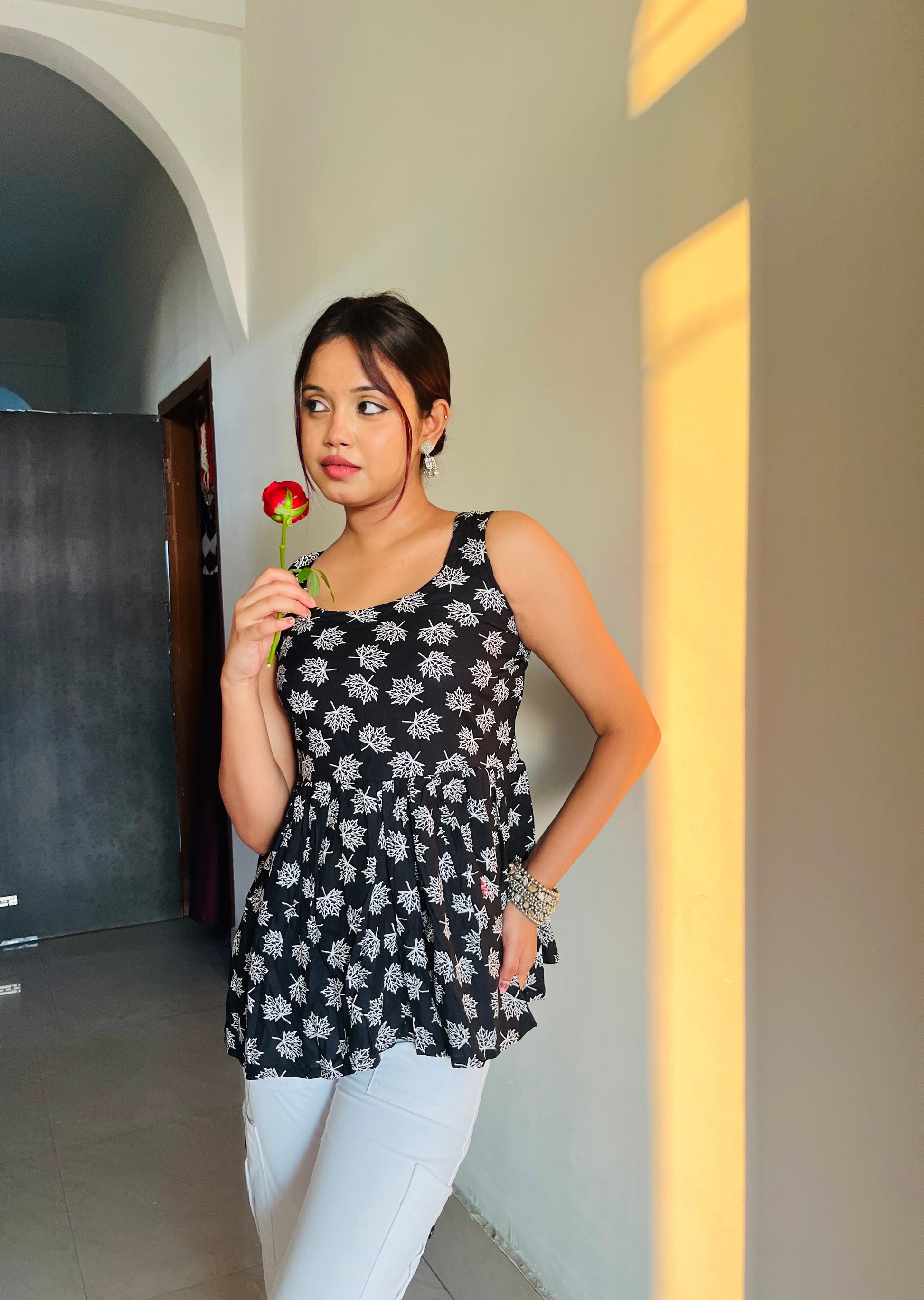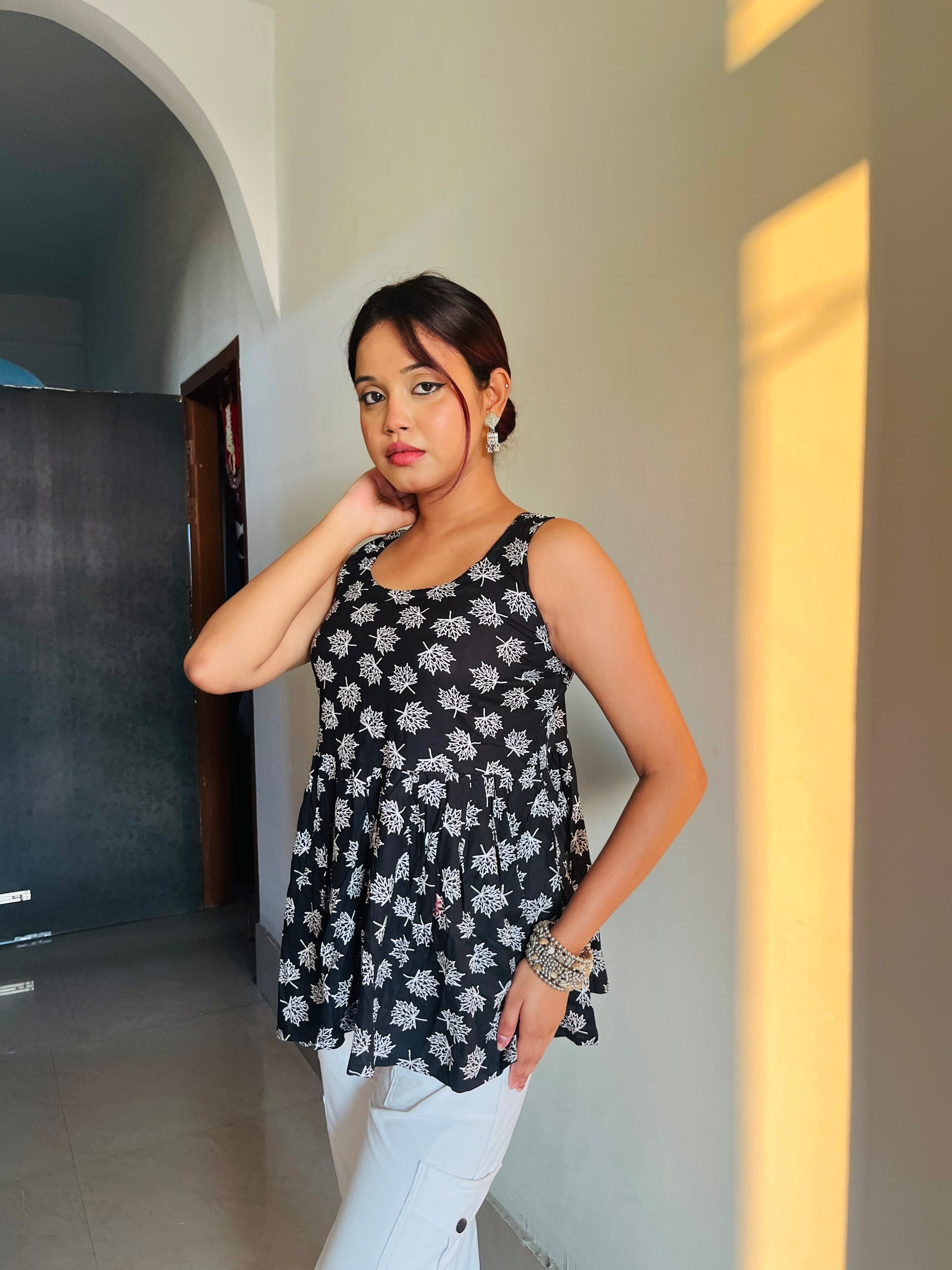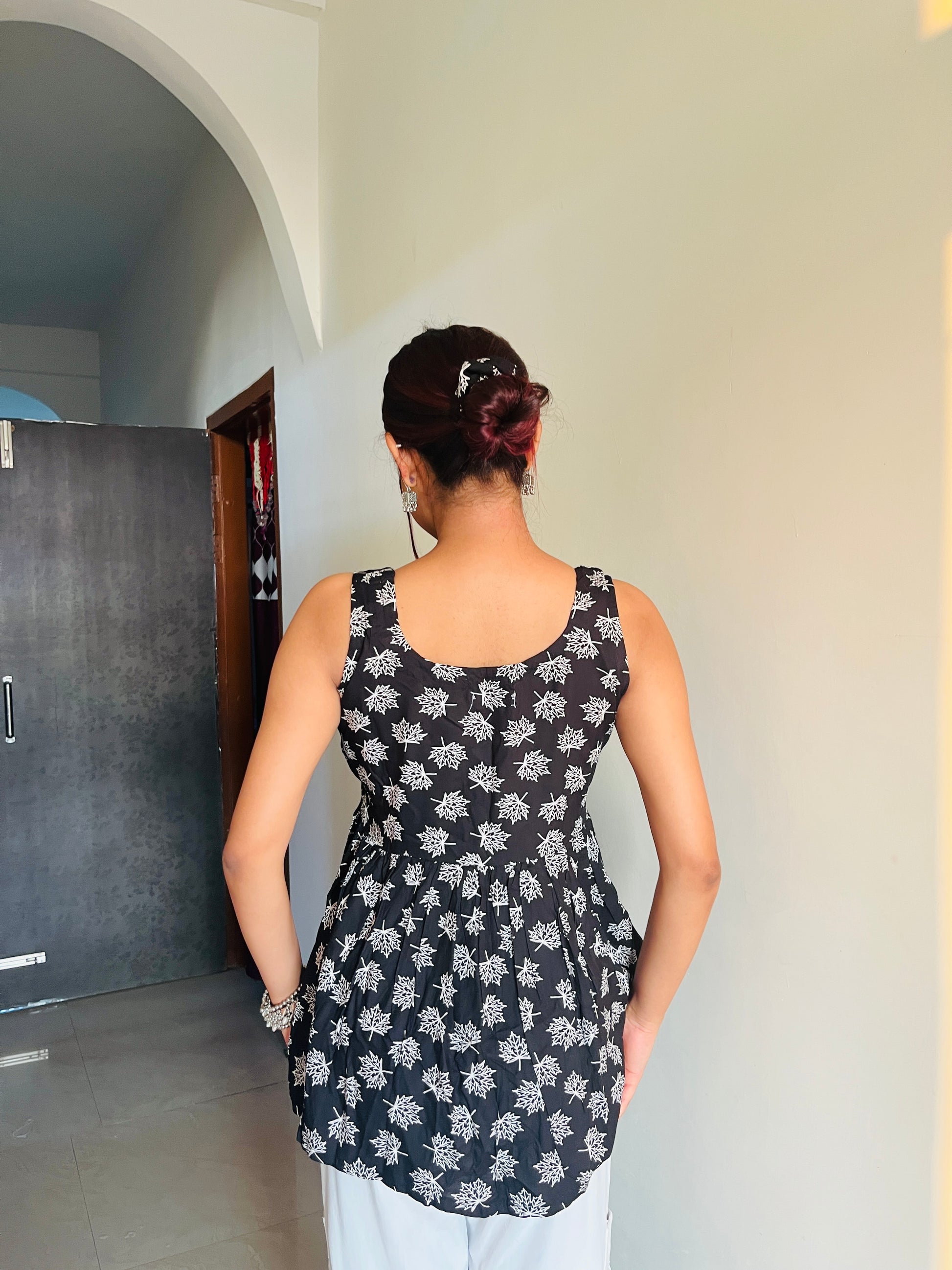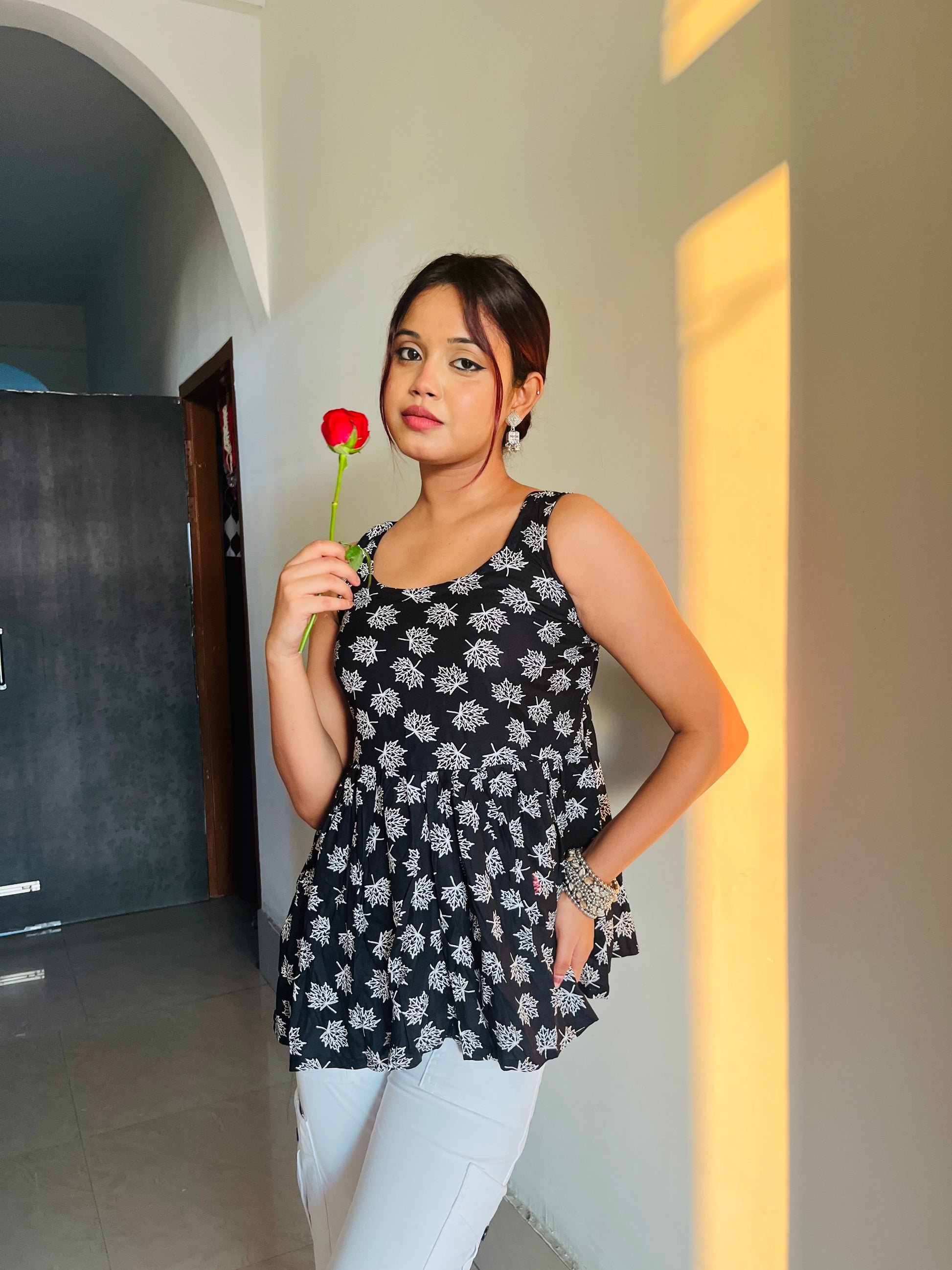 Soft floral motifs bloom against a rich black base in this cotton kurti- gracefully flared at the hem, refined at the bodice. Perfectly versatile for daily elegance or an evening out.