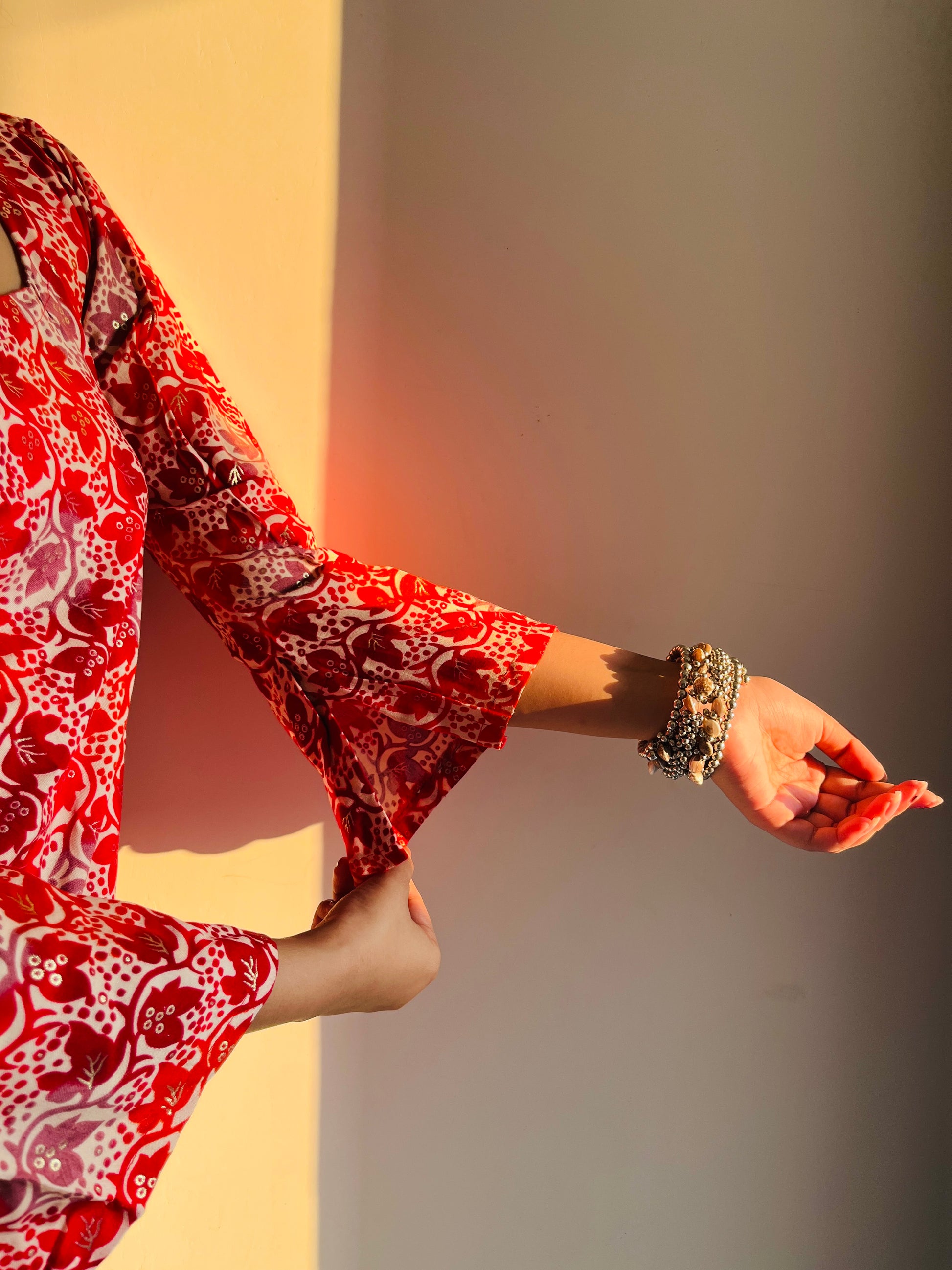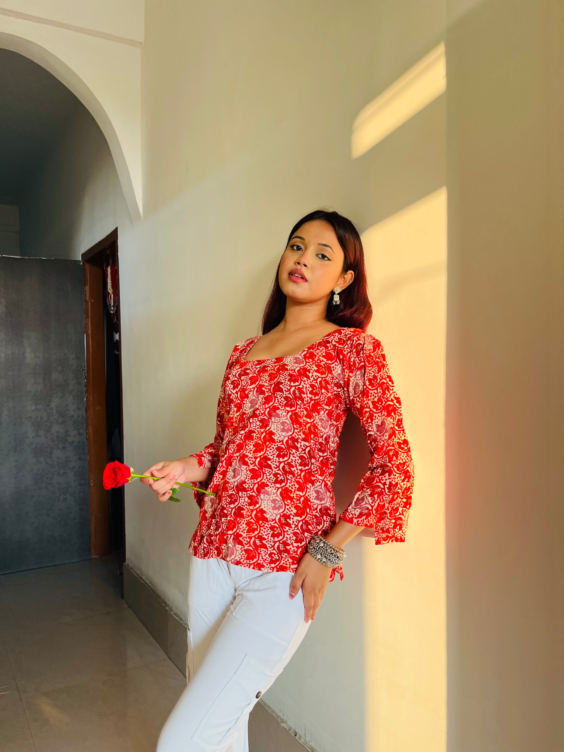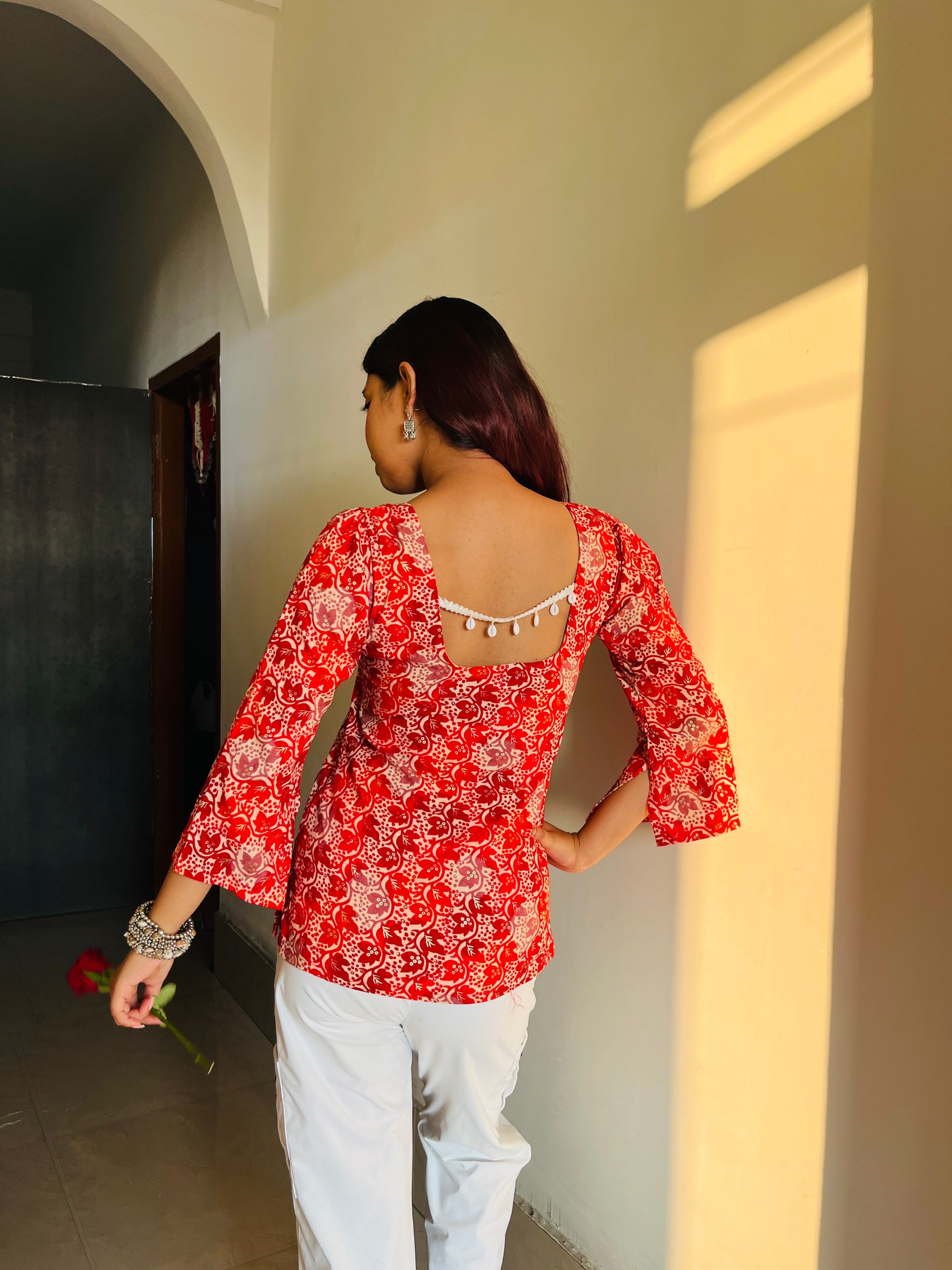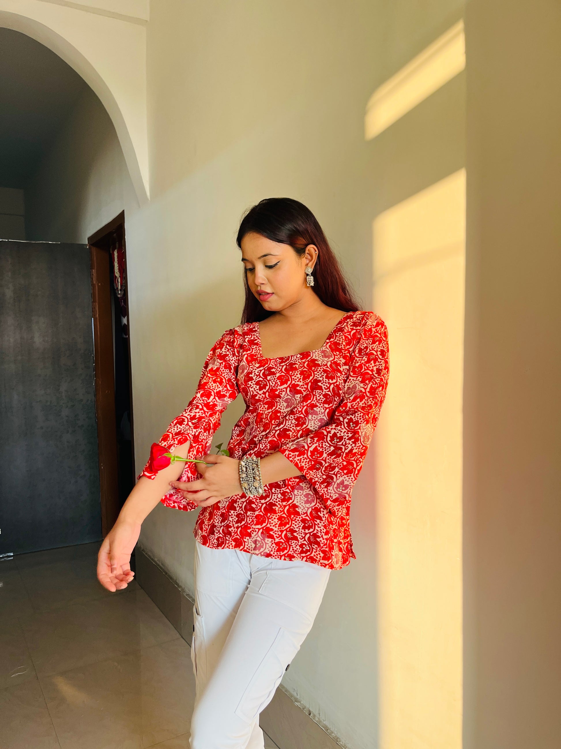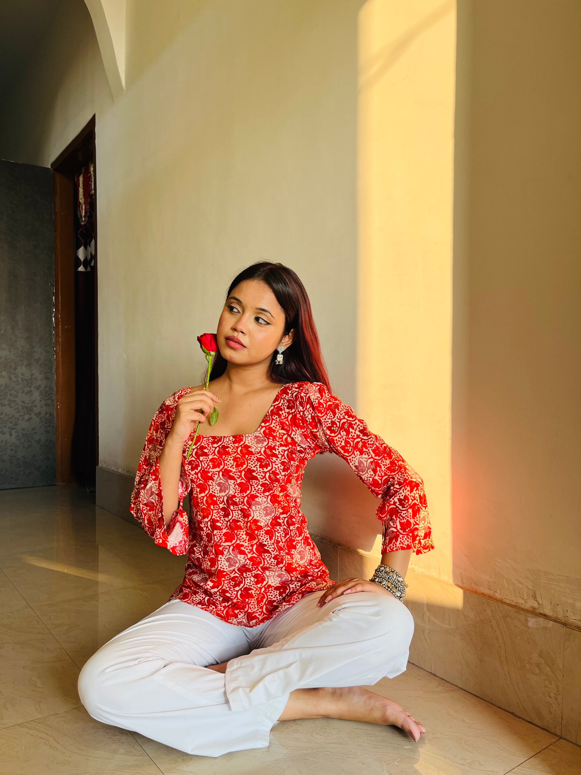 Radiant red cotton kurti adorned with oversized white floral patterns and delicate detailing - bold, beautiful , and alive.