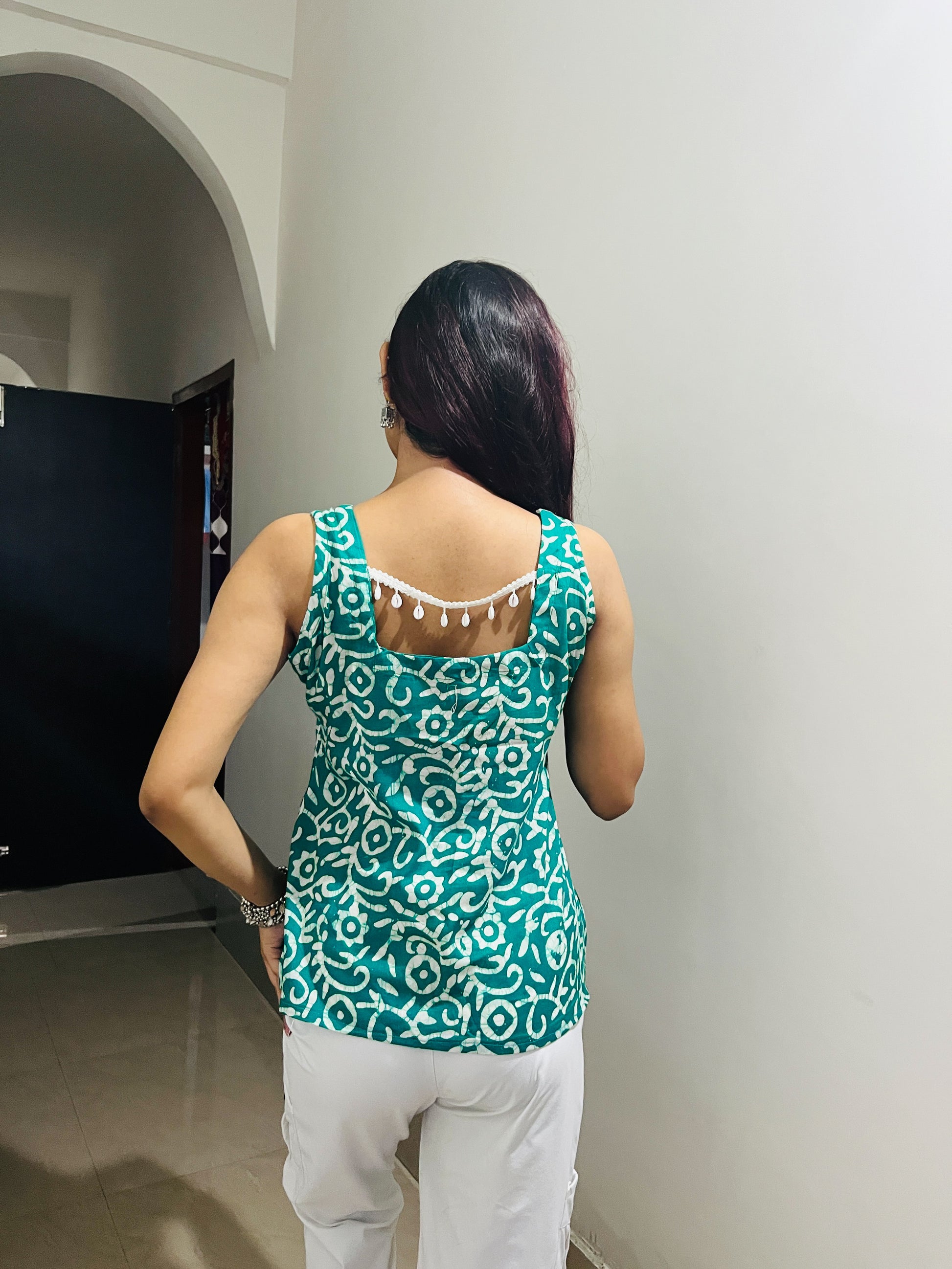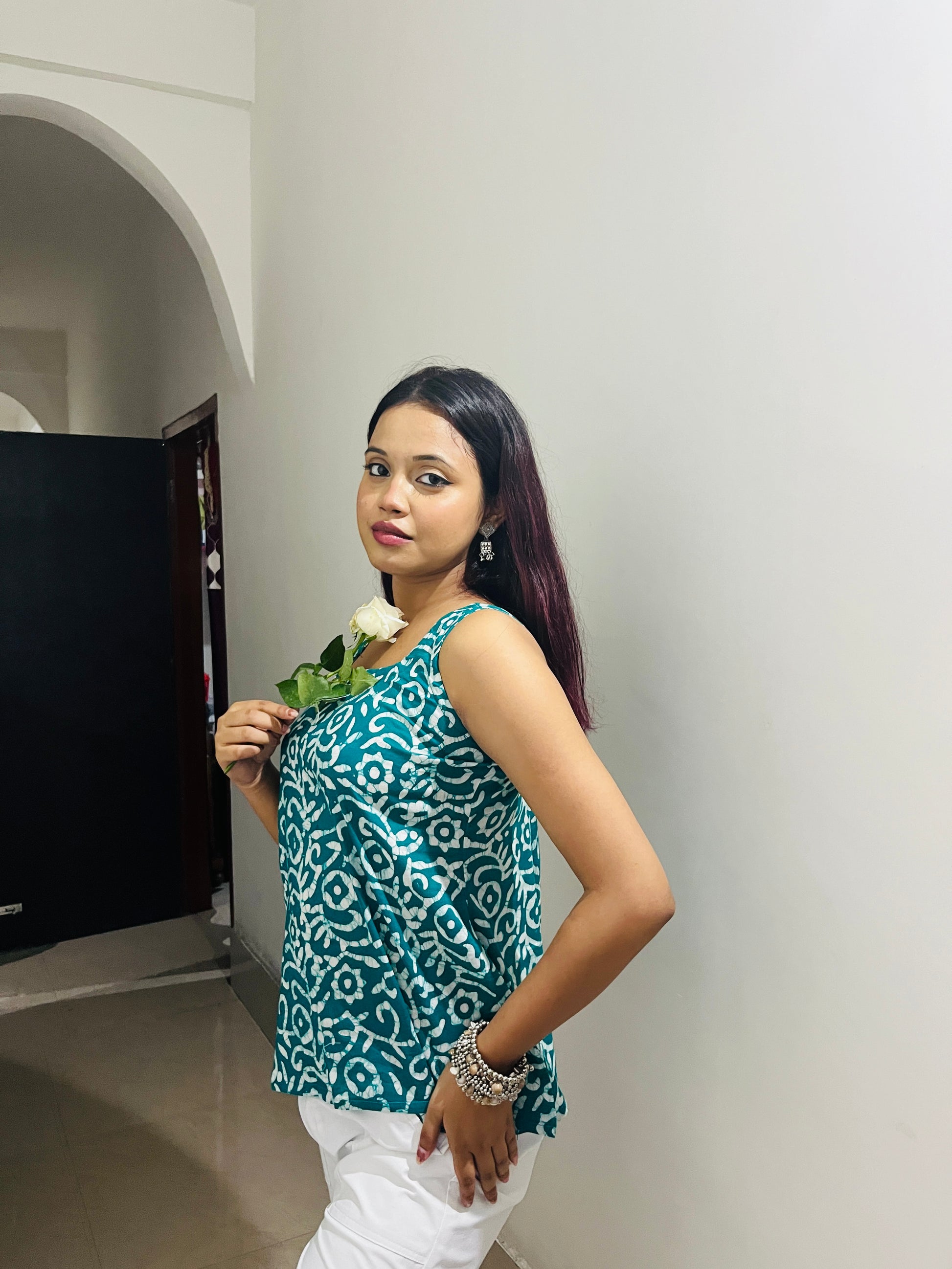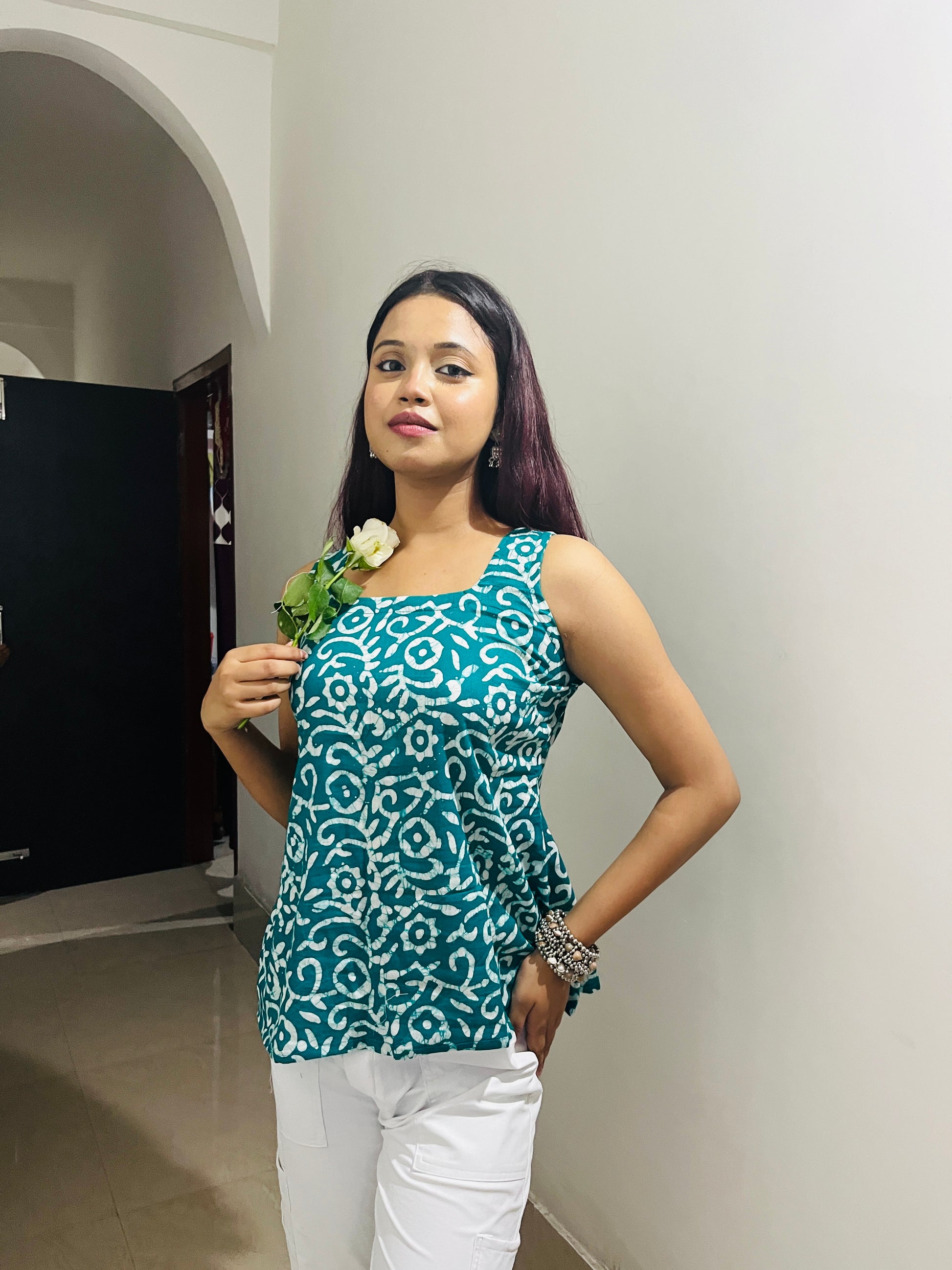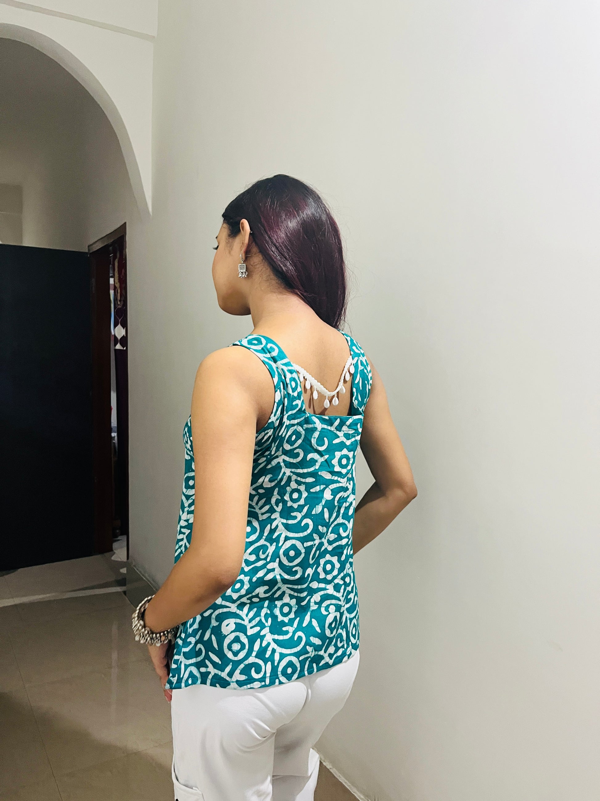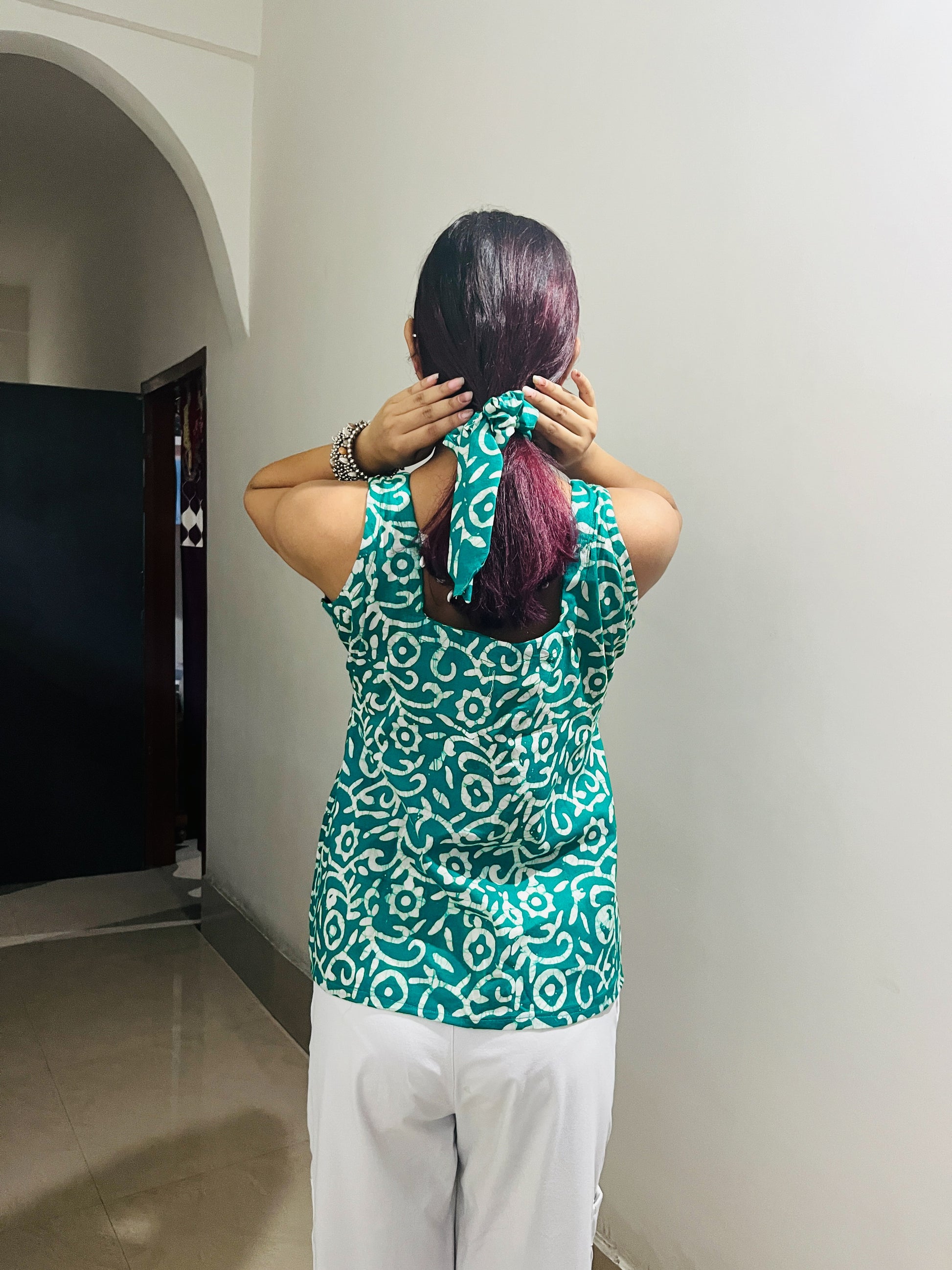 Bright indigo cotton top with classic block-print motifs and a relaxed fit-effortlessly elegant. Fabric: cotton| Fit: relaxed | color: indigo Blue Comes with a matching scrunchie - because details matter.