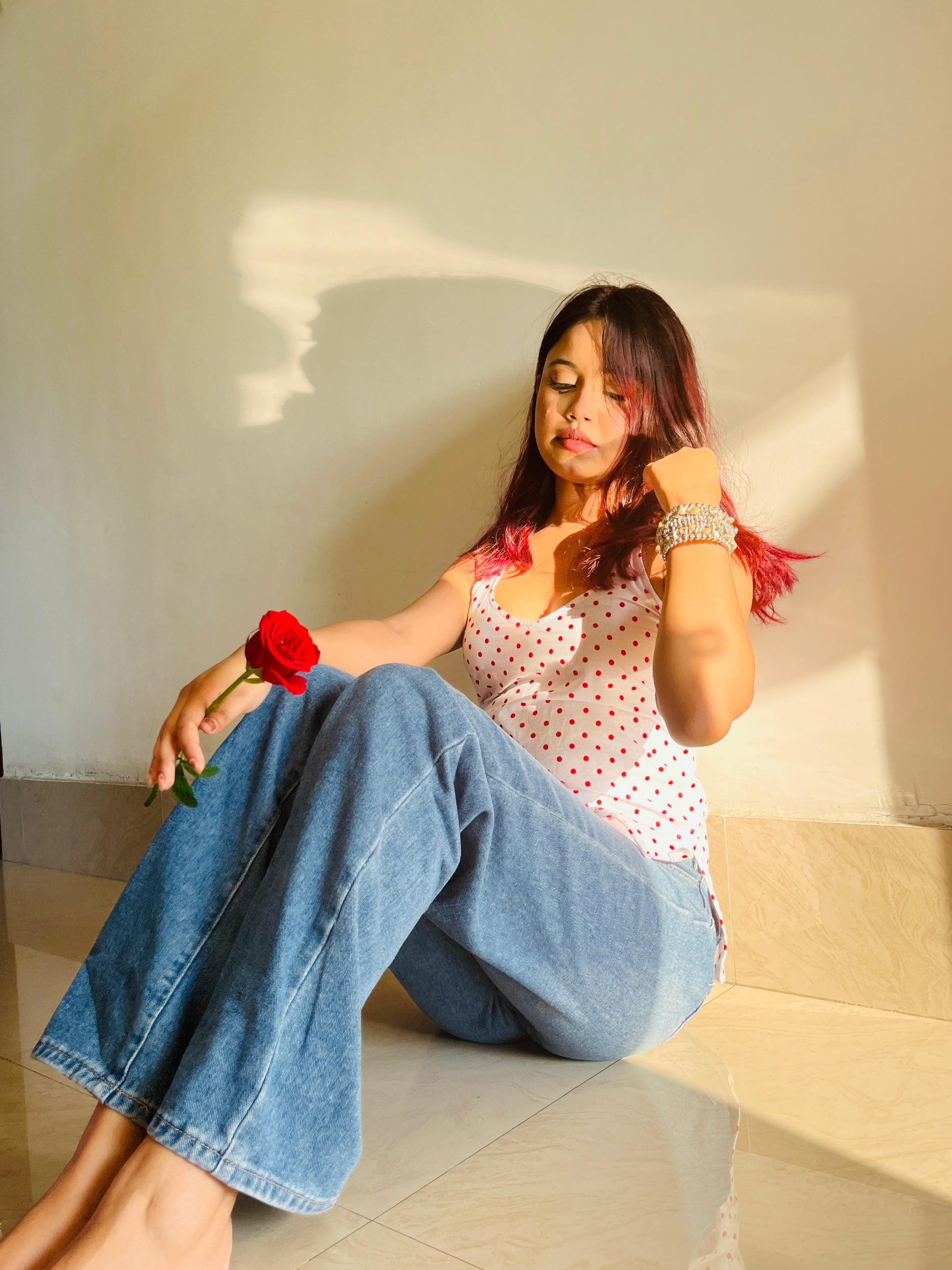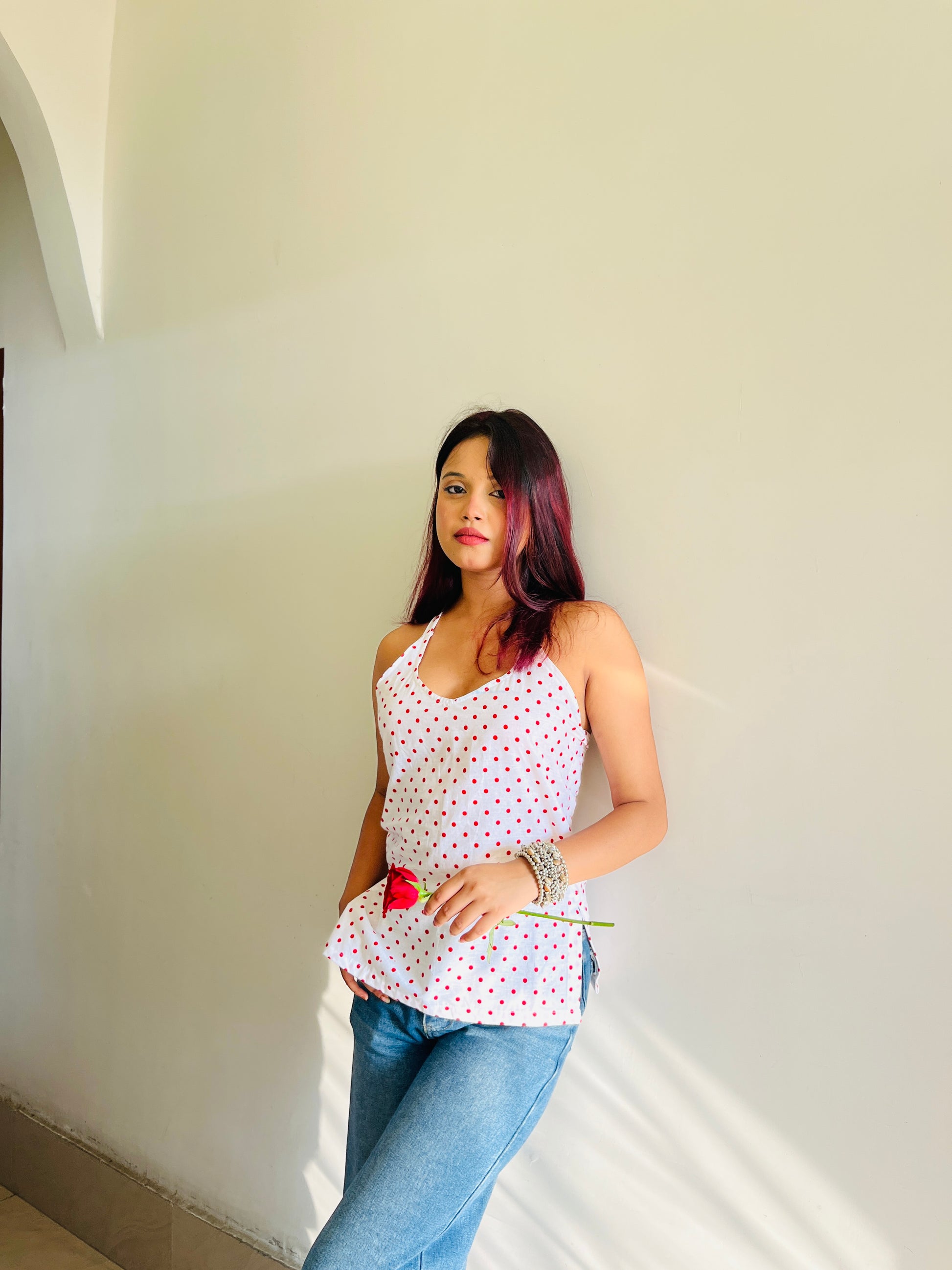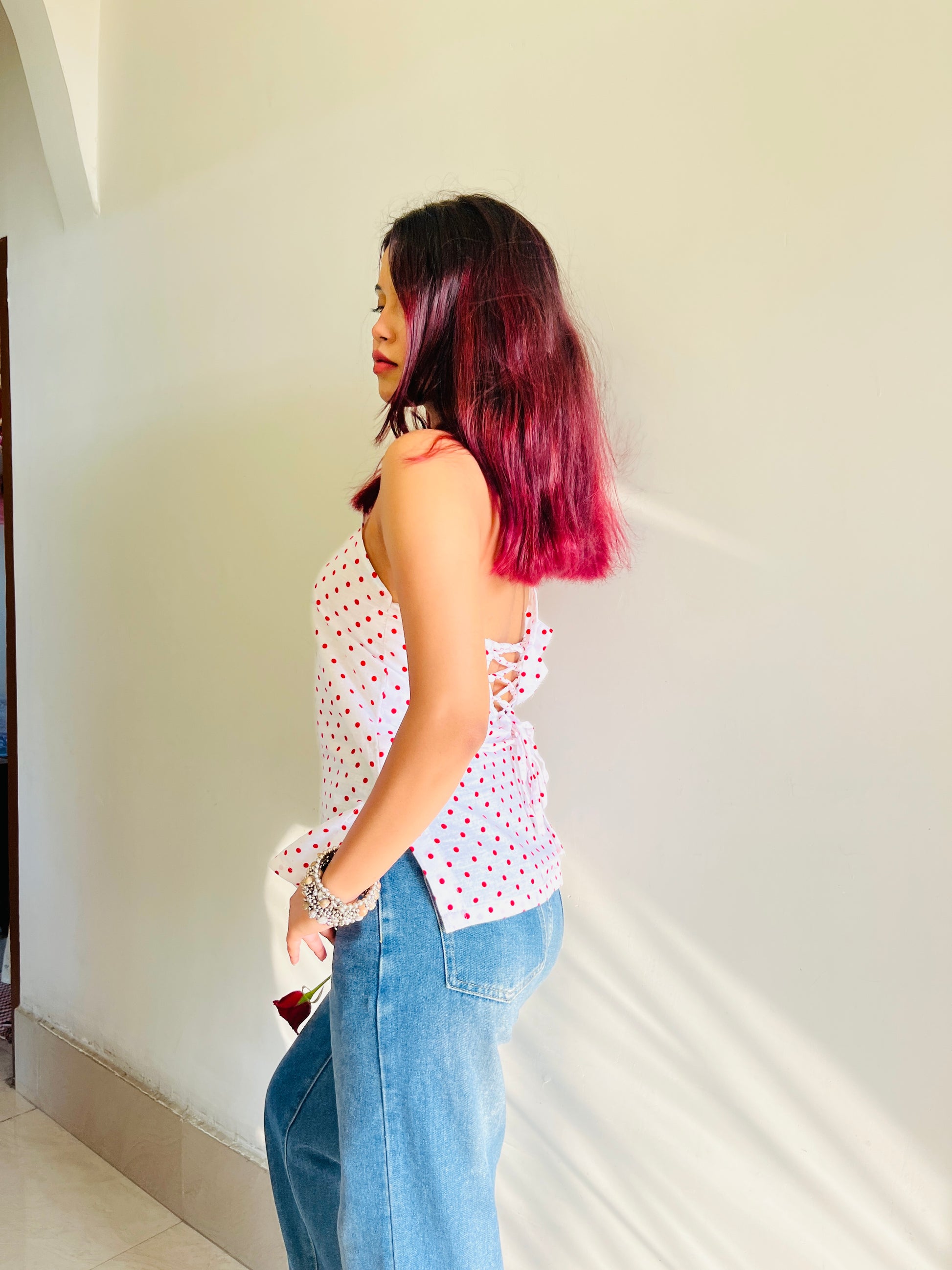 Subtle polka dots entwined with floral petals- playful and poised in one piece .