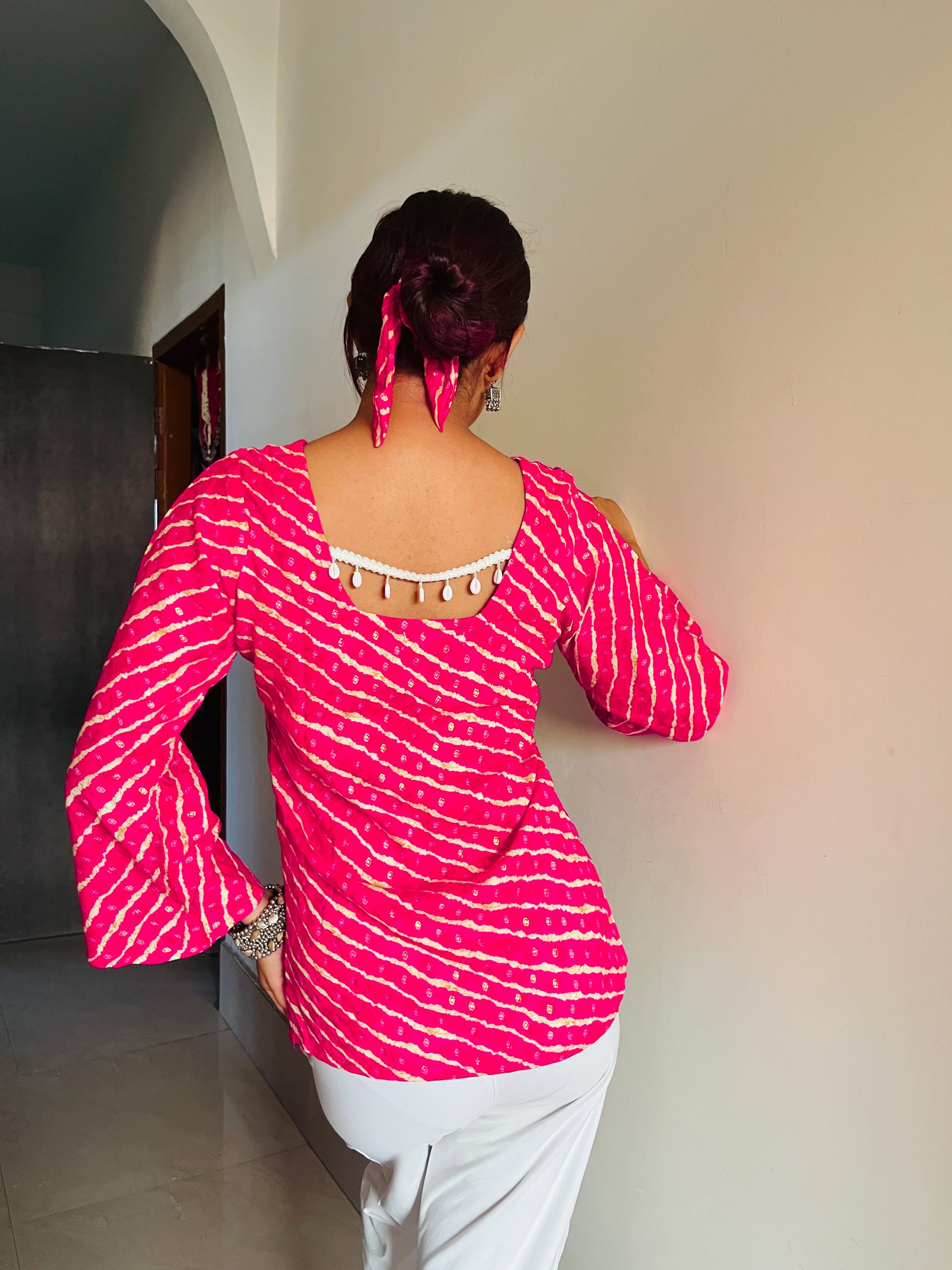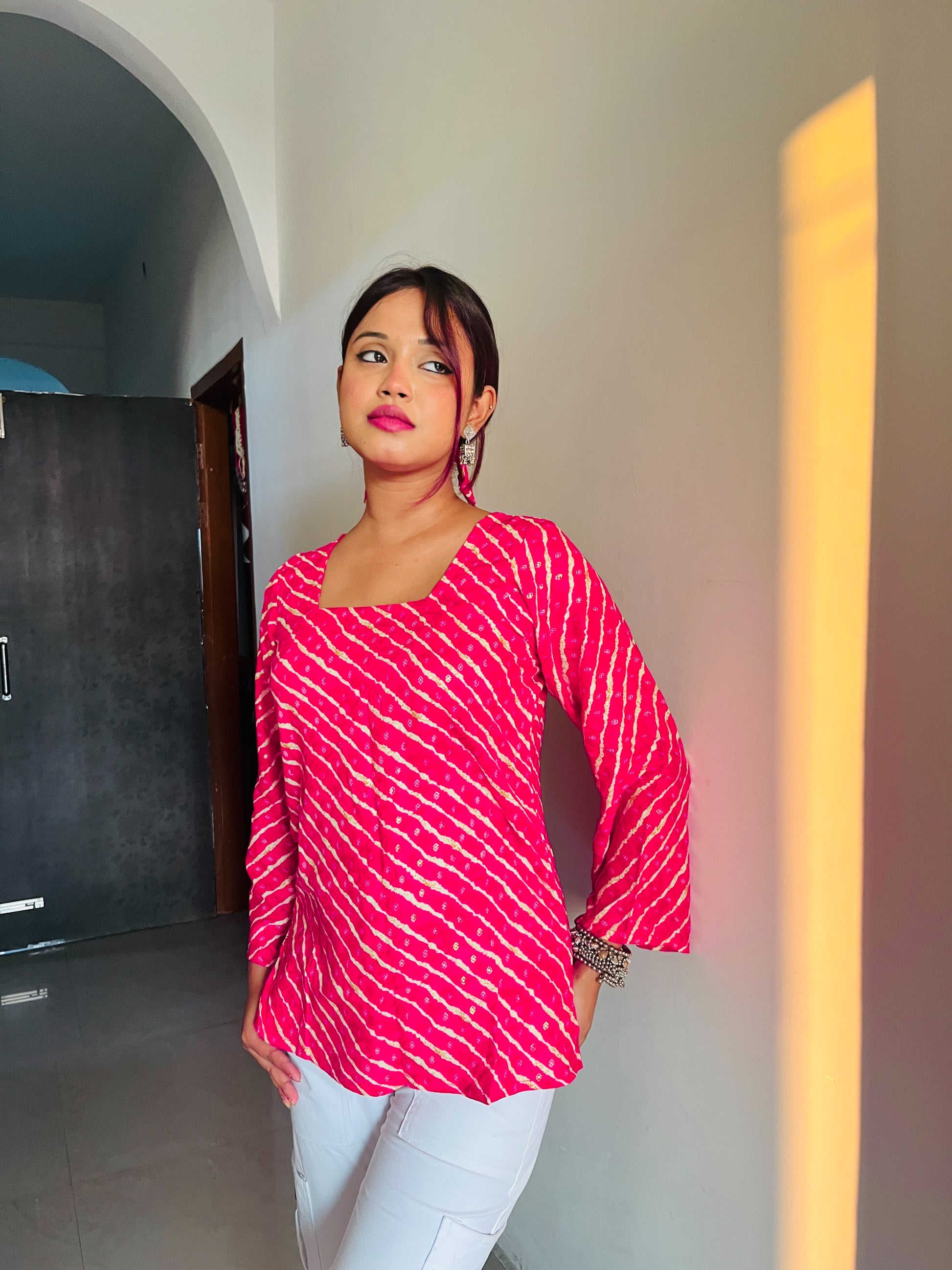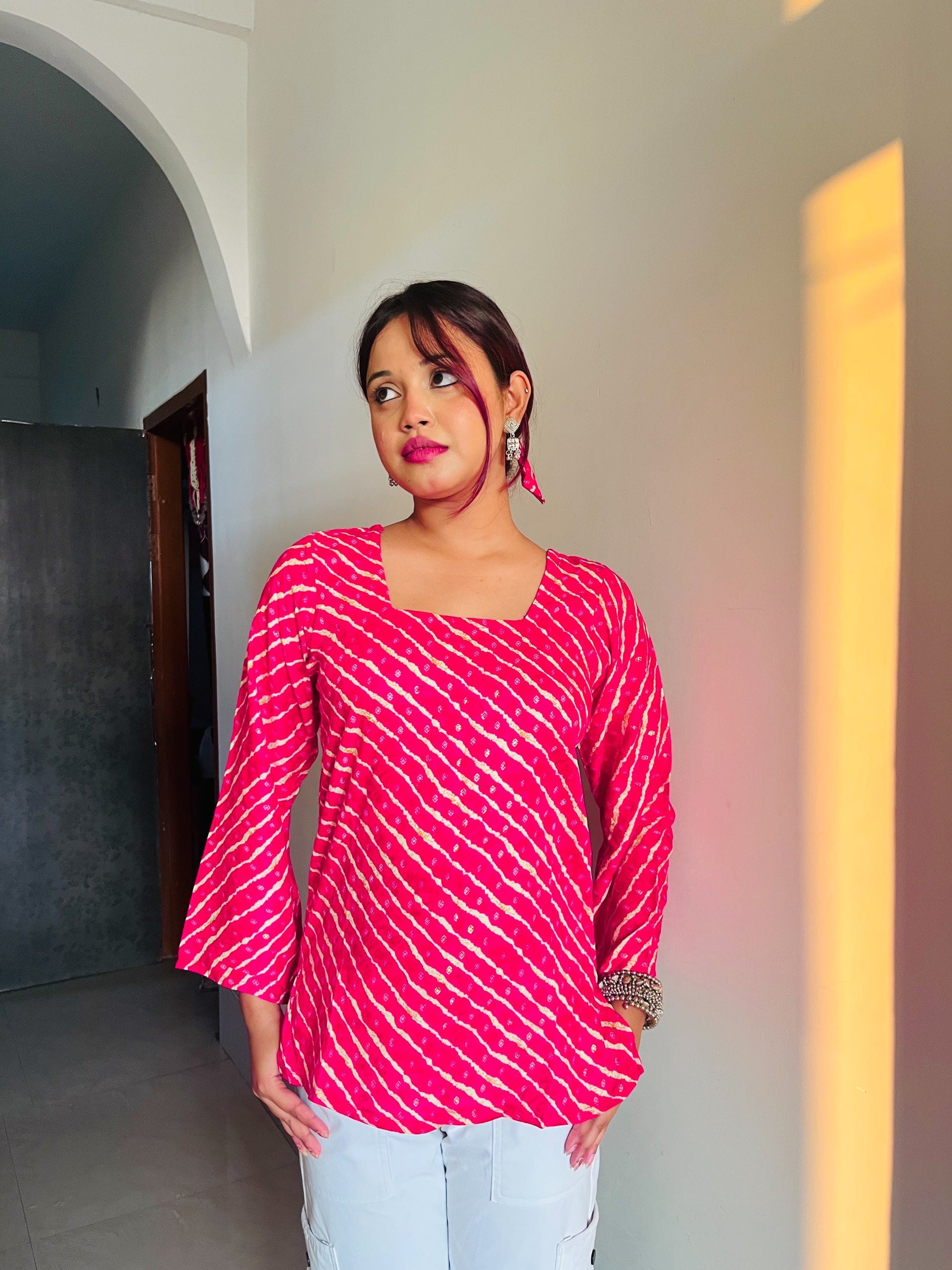 A breezy cotton top in vibrant crimson pink with diagonal Bandhani-inspired prints. Flattering square neck and flared sleeves give it a relaxed yet chic vibe.